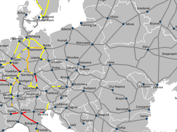 En el siguiente mapa se muestran las principales conexiones de ferrocarril y duración de los trayectos entre las ciudades de Polonia.
